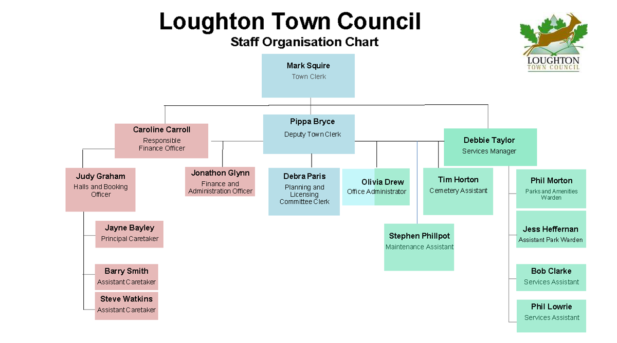 The Council consists of 22 Councillors representing the nine wards of Loughton, and currently employs 6 full-time and 10 part-time members of staff. The Councillors are elected every 4 years; the most recent election being held on 2 May 2024. Loughton Town Council Staff Organisational Structure: